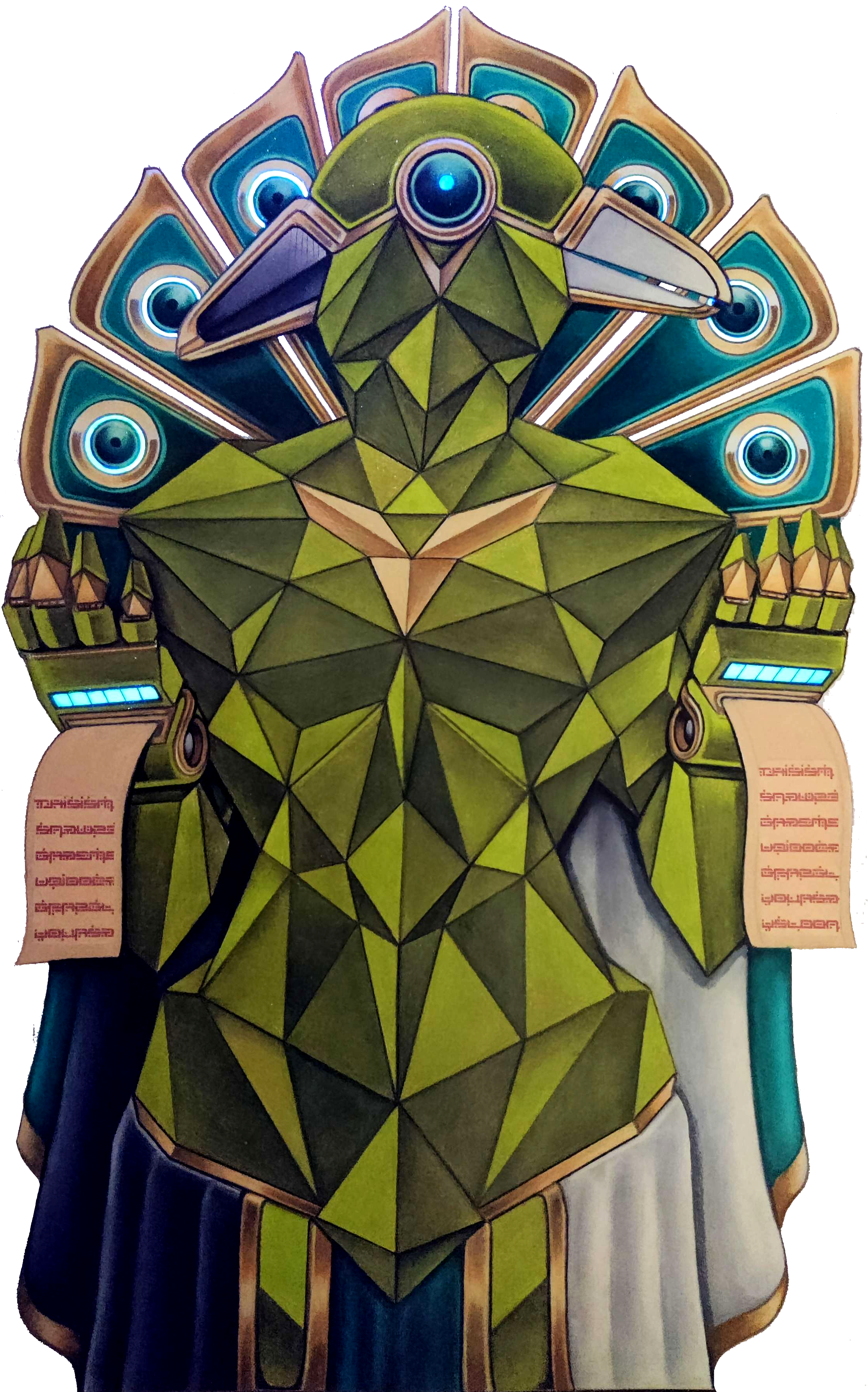 Details: Though her persona is female, she wears the form of a peacock – most Reporters do. She’s more graceful than most, and often shows up under an Invisibility cloak because taking pictures doesn’t break it. She needs to use the M-TAC network to send them, however, nothing goes out live. For this reason she tends to stick to populated areas and large cities with an Arcanar Guild affiliate. Her green crystal flesh looks like emerald or peridot supplemented with gold trim, especially around her many eyes. Her Invisibility cloak goes well with various domain powers such as Pass Without Trace, though her Prying Eyes are only semi-translucent and can be spotted by observant parties. Lastly, she’s able to print (mis)-information scrolls directly from the back of her hands, passing out pictures, tracts, leaflets, and other tabloid-type material to get her point across.