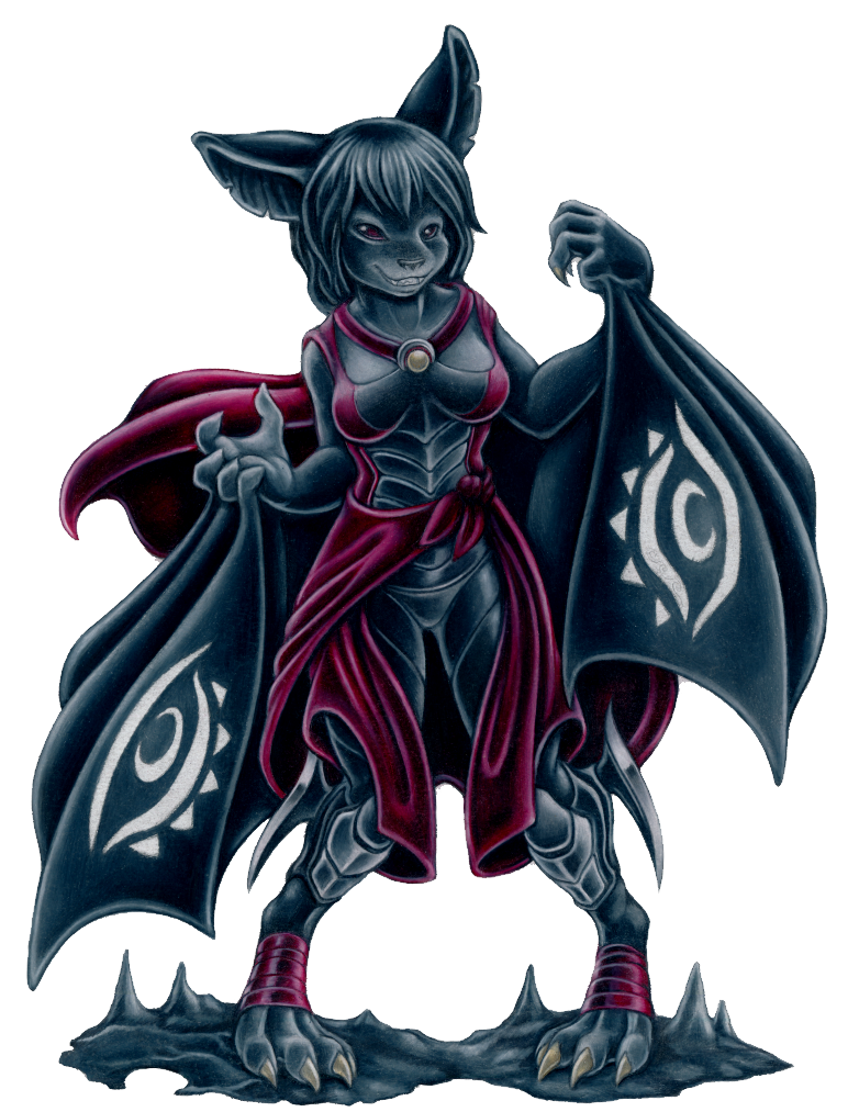 NIZRIL CEPN FIFTH EDITON Physical Description: There are two species of cepn, one of which is incorrectly believed to be extinct. The dominant species, the N-Type (or Nizril) are descended from the mutated and uplifted vampire bats bred to exterminate the denizens of the underworld. The Creator State saw no need to send their own soldiers into the deep dark, favoring instead those who were born to it. Most of them are small, gaunt, and not particularly impressive, having only partial wing patagia and a humanoid form that’s one step closer to the kuil body than the first generation of nilkind. Most are gloss-black, though some have a mutation from the original stealth line whose fur reflected no light at all. The lighter, less violent variant, the K-Type (or Kizril) were the pilots, and rare even before the war. There was no need for a large population, as it only took a few of them to fly the exotic aircraft for which they’d been customized. They are thought to have been wiped out by the other, more aggressive half of their duon in the dark years that followed the Automatic War, though this is actually a rumor they started themselves before vanishing from the map. They may have taken a few of their ancient aerodynes with them. Society: While Cepn on the mainland often adapt to the local culture, the citizens of Noctae live within a rigid and often harsh social hierarchy. At the top of this structure presides the immortal and unchanging ruling body, the Ministry of Saints, who divide their subjects into classes or castes beneath them. Much of Cepn society and culture revolves around the Ministry, who operate somewhere between government and cult. A near religious devotion is encouraged and maintained, and their word is law. The Ministry consists of four members, each of whom accepted offers of immortality from the Spiral in exchange for clandestine support, and whom jealously guard their dominion. While mortality and death has always been a part of cepn history and identity, a more pervasive brutality and cynicism has taken hold. Assassination was once seen as a necessary tool to prevent the barbarism of large scale conflict, but has become a way of life for many, and a misguided model of strength and cunning that has led to murder as a commonplace solution, and the cheapening of life that permits slavery to thrive. Yet, there are still many cepn that do not accept this world view. There are those who believe there is a better way, who maintain that compassion is not a weakness, and that exploitation is not necessary to survive. There are those who still believe in mercy, even if it must come from a dagger or a vial. While they must lurk in shadows even deeper than those of their fellows, a struggle for the soul of Noctae continues. Relations: The cepn are famously xenophobic, unwilling to give outsiders a deeper look into their world. The exceptions are those brought into Noctae as slaves, to be used as livestock and labor, never to be returned to the mainland. The slave population has waxed and waned over the years, growing from a handful in the early days, to nearly a 1:1 ratio of slaves to cepn at a few points in their history, and has since hovered at around a third of Noctae's total denizens. In a turn both repugnant and tragic, the cepn have become dependant on this captive population, and while the institution is no better here than it is elsewhere in Rym, some strange quirks have developed. The relationship between this slave population and the cepn has become complex, and is an ever-present source of tension and controversy. Alignment and Religion: Nizril tend towards darker alignments though mostly as a function of their society as opposed to any innate instinct. When separated from their harsh environment they can adopt any sort of ethical code and fit into non-cepn populations with only the minor difficulty of their need to feed on the blood of others. They're not prone to any sort of worship however, aside from a vague remnant of militaristic kuilism from which their ancestors descended. They're quite comfortable on their own and while not particularly nihilistic they do tend to reject the idea that higher powers care for them. Adventurers: Within their own society, the nizril often find survival itself to be enough of a challenge without needing to venture off looking for more. Their lives are often intertwined with generational conflicts or social struggles and those who leave this structure may be seen as either troublesome or disloyal. On top of that, their reputation for such intrigue may make it difficult for them to find groups of trusting friends, or those who would share any sort of trouble they might go looking for. The most common sort would be revenge, after all.