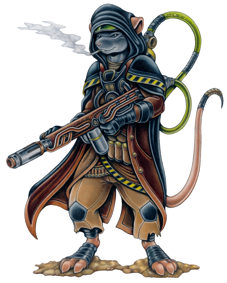 GREY IXIS FIFTH EDITON Physical Description: There are two species of these anthropomorphic rats. Grey ixis are tiny, hardly bigger than their original ancestors, yet capable of manipulating the world around them almost as effectively as their larger counterparts. They work in large swarms, having been bred with certain clone-like features to minimize difference of both appearance and purpose. They range through the grey spectrum from shale-black to ash-white, and are distinguishable from normal rats by their organized ranks, miniature weapons, battle standards, and foul language. The larger brown species is still Small, but a giant compared to their cousins. Brown ixis are more broad-minded and independent, though they share the majority of the species’ rodent features, such as their long yet semi-squat bodies, long tails, and burrowing claws. However, their greater mass has thickened their hindquarters and strengthened their legs considerably to support a new upright stance. Both species have large, dark eyes, a rat’s muzzle, prominent incisors, and large, sensitive ears. They like ragged, functional clothing with an emphasis on pockets, sheathes, and hidden folds for their many, many possessions. Society: Shaped by the experimental regimens which uplifted them, ixis display an astounding ability to work towards a common goal, whether it’s to conquer a territory or overcome much larger adversaries. Unfortunately, this same trait makes them extremely manipulable, especially in groups, and their behavior will come down to who’s leading far more than it will for most. If a set of principles no longer functions within the group, they’re more comfortable adopting another than trying to think for themselves. For this reason, it’s never easy to know how a group of them will behave. In their native country, they’ve driven out all non-ixis long ago and have little outside perspective, seeing non-ixis as gigantic monsters or titans from distant lands. Vindova’s mountain fortress contains the (now sacred) facility in which they were first created, a site they have fully occupied and will never abandon. It is the heart of their culture and only their most powerful leaders have access to the wonders within. Relations: The ixis have no love of other races, especially those whose forms were derived from their generations of suffering. They were never part of the greater world, or the Creator State, but instead relegated to secret laboratories and complexes such as the one they call their homeland. Amongst their own kind, they’re quite giving, empathic, and egalitarian, even among the two very different species. A shared animosity towards the outside world gives them unparalleled unity, though this is maintained at the cost of freedom in most regards. Relations are governed by a strict caste system, geared towards the strengthening of their nation above any individual desire. Even their license-plate names reflect this. Alignment and Religion: The ixis worship the new State, their own, in which they have no need for the outside world. They’re among the few creatures capable of hosting two different alignments – one for their own kind and one for others. This duality is a function both of their upbringing and their ancestral animosity towards the other races (especially the big ones). Adventurers: Ixis rarely adventure, being homebodies and largely regimented towards vast collective projects. Those who do generally prefer to do so in bands of their own kind, and only within their own homeland. Now and then, however, one might find an exile with a much more open view of others, especially those who disrupt the breathtakingly-racist stereotypes they learn back home.