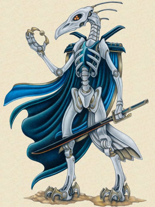 N-MACHINE FIFTH EDITON Physical Description: Independent Machines vary wildly in their design, as they were custom-made for the individual inhabitant and their respective tastes. Such tailored bodies were typically bipedal, Medium-sized, and composed of the same age-retardant substance as so many of Aethos creations. The one thing they all share in common is that they look less like living beings, and more like walking sculptures. This type of Machine is made from luxite metals and ceramics, and is easily mistaken for a robot, golem, or other construct. In truth, it has more in common with the undead, and the white coloration of most such Machines is funerary in nature. They’ll often have glowing eyes and strange voices. Society: Machines have only the remnant of a past society, with most now relegated to hermitage at the fringes of the new age. They’re unwelcome in most communities, who see them as a dark reminder of the kuil dynasty and the Automatic War. Most such Machines remain in the wasteland of Axis, dwelling among the ruins and subsisting on readily-available components to maintain their ancient bodies. They remember little of the second age now, however, save for the fragments in which they exist, like ghosts haunting houses. Some are still in denial of their civilization’s end. Relations: Though they have little in common with the inhabitants of the new age, Machines will still form relationships with more open-minded individuals or communities in order to acquire materials or information. They have lost virtually all of their emotional capacity over the centuries and while not purely cold and logical beings, they usually come off as such. Their goal was to be more like Aethos, to be perfected, and while it didn’t go quite as promised, some still crave the vestigial trappings of their former mortality. Though prefixed with ‘he’ or ‘she’, these devotees of Aethos are androgenous – a condition of their transference to immortality. They have little use for such artifacts, or so they thought, anyway. Alignment and Religion: Independent Machines gravitate to neutral alignments, though enough of the original persona may remain to provoke variations. They are irreligious by nature, though Aethos could be thought of as their deity and few who meet them have any distinction between the two types. They are all assumed to be puppets or extensions of the false god. Adventurers: Machines do not adventure, they perform important tasks. Centuries of non-biology have eliminated the thrill of such things, and if there’s adventure to be had, it wasn’t the intent. Of course that won’t stop them from getting drawn into something new against their will, and there have been instances in which danger and daring have re-awakened long-dead passions or shattered centuries of ennui, or re-learn the value of companionship in heroic moments.