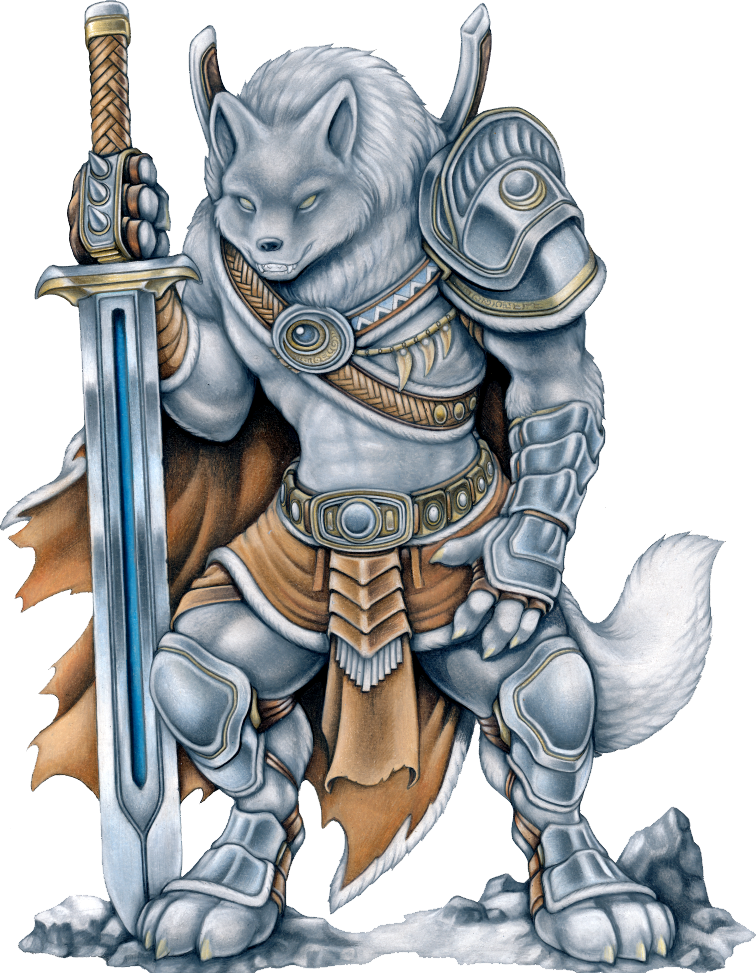 NORTHERN SKOLE FIFTH EDITON Physical Description: There are two broad species of skole, one being the wilder wolf-like northern variant, the other having retained more of their original domestic features. Both are somewhat larger than humans and considerably stronger. Northern skole bear predominantly lupine features, having adapted to colder climates over the centuries since the collapse of the Creator State. They are larger, heavier of limb and thicker of coat. Southern skole are leaner, more densely-formed and short-coated. They have adapted to warmer climes, and tend to have a more sophisticated bearing. Society: Skole society is rough no matter where you find it. Though the northern barbarian clans are renowned for their rough and rugged natures, the southern clans are no softer than their lupine cousins. Both cultures retain the militaristic shell of their former lives and purpose. They have done what they can to make a new society that’s all their own, but their crippling lack of art and culture was by design, and very difficult for them to overcome naturally. They have picked up a few new tricks along the path to independence, but the impression outsiders often get is that the skole are still clinging to the tenets of a culture that’s long-gone. They are waiting for something that will not come back. Relations: Skole may be gruff and serious-minded, but they do show warmth and affection to those with whom they share loyalties. In fact this is just about the only way to even get anywhere close to friendship with them, for they have no ‘casual’ relations. Few could be more loyal to cause or companion, though winning that loyalty is often an arduous, dangerous undertaking. They have no need for indirectness or tact, as this was the language and manner of the masters they’ve long since lost. Skole form strong pair-bonds, either by intimacy or battle, and can be honest to a fault. They rarely grant the benefit of the doubt to those they don’t know, but their acts of fealty and sacrifice in the face of adversity is as well-known as their innate mistrust of the unfamiliar. Alignment and Religion: Skoles have a strong predisposition to order, whether fair or cruel, and don’t do well with unanticipated deviations. They’re quick thinkers but often lack the creativity to anticipate or overcome chaotic situations. Those who follow any code of honor or ethics will do so with exceptional enthusiasm and zeal, however, and this can become contagious, especially among other skoles. As a result they will tend to gravitate towards strong leadership, with wisdom and charisma being every bit as important as martial skill or devotion. Their military origins make them ideal soldiers and followers, along with their formidable size and strength. Adventurers: Skole are constantly driven to prove their worth, both to themselves and others. They learn to see everything as some form of challenge, which helps them deal with their problems as ‘foes’. Great hunts, noble duels, and the conquest of terrifying natural obstacles will do for most, but others venture abroad in order to expand their horizons and their range of challenges. They don’t do anything easy, and have an unusually difficult time stooping to simpler challenges.
