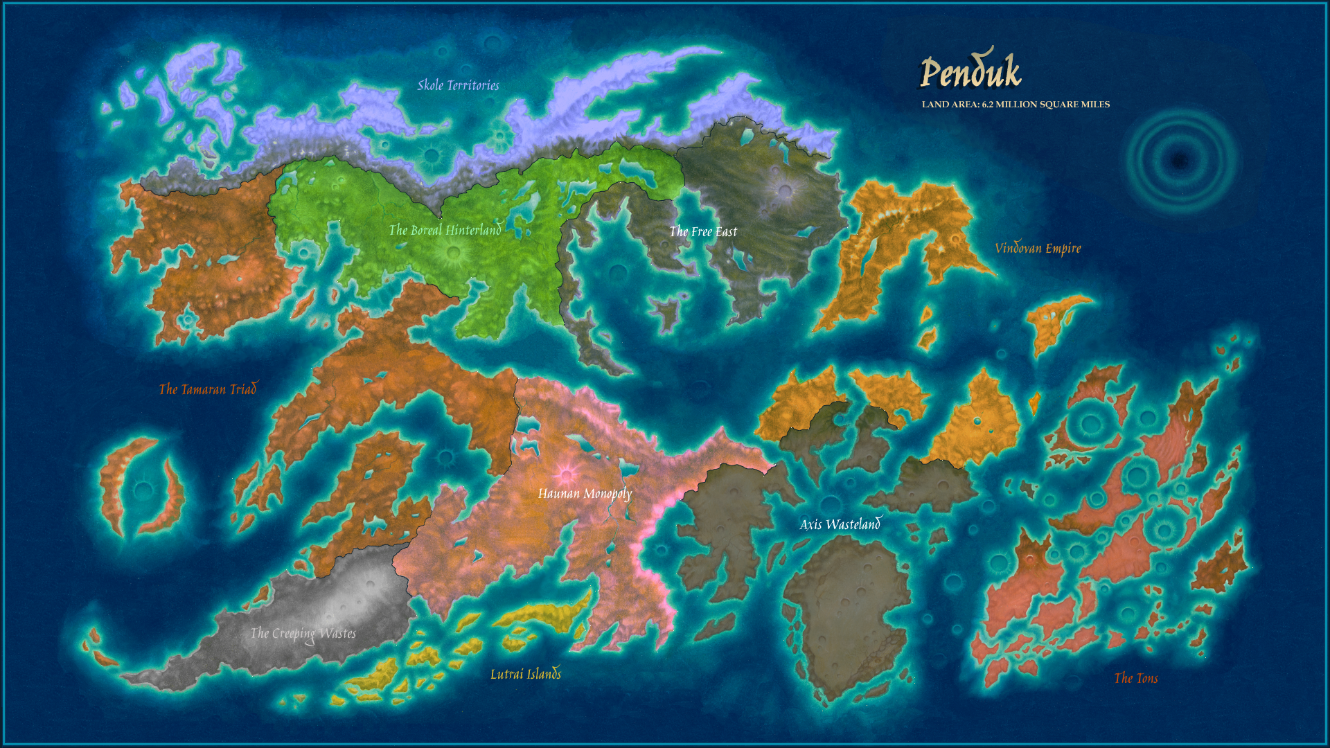 Here are the most significant territorial factions of the current era. For roughly two hundred years, the recovery of the world’s population has been directed by the efforts of two opposing powers and their various allies – the Tamaran Triad and the Free East. Each has its roots in the ancient conflict of the Automatic War, being descended and from and biased by long-ago alliances and animosities. The conflict still plays out in some places, though for the most part the world has moved on. Its constituents have new priorities. Two hundred years ago, the haphazard repopulation of the Eastern Coastal Territories was interrupted by Her Excellency, the Decider. She claimed to be the last living remnant of the Creator State, and with her arsenal of strange weapons and mechanical followers, she took over the provinces of Erdanis, Caefax, and the Twin Paradise which now bears her namesake. This Tamaran Triad is now considered to be the world’s most powerful faction, limited only by the range of Her Excellency’s fearsome weaponry. Opposing her are those driven from the West by her ambitions, those who fought against her or refused to follow her direction. They are the provinces of the Free East, those who braved the wilds of Arthandur to escape the expanding radius of the Triad’s control. This boreal hinterland separates their territories, at least for now, and resists either side’s intrusion. To the south lies the third most significant world power, the Monopoly of Haun, with its vast resources and enormous slave armies. They moderate between the two more ideological factions, technically neutral, but leaning towards the wealthier Triad for the most part. The remaining factions are for the most part either independent and of scant importance to either side. The Vindovans keep to themselves and have little interest in trade or expansion, while the skole clans of Freilu are too few in number to take back Erdanis, their former home, and care for little else aside from survival. The lutrai of Cekus, meanwhile, have found territories of little strategic importance, and have no use for politics. Nevertheless, the two opposing powers have swept them up in their conflict, seeking every possible ally or advantage. Narada and Axis are ‘dead’ territories and haven’t been claimed by either. See also: Atlas Video |